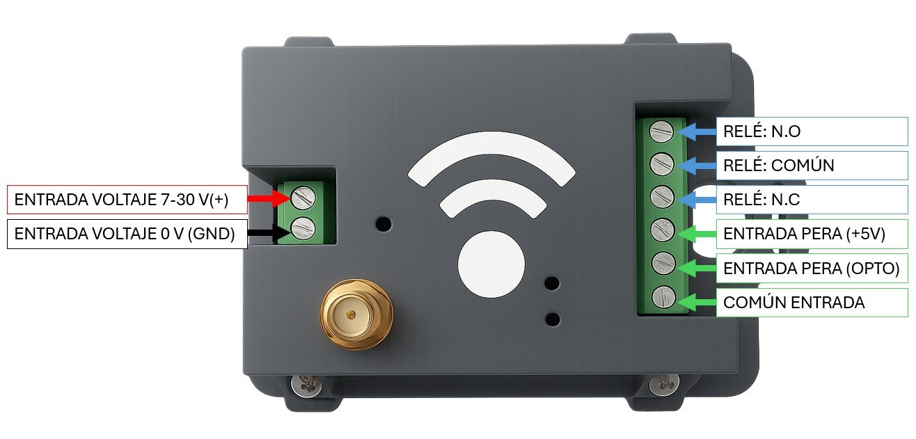 Este dispositivo crea un puente inalámbrico punto a punto (P2P) o punto a multipunto (P2MP) para el envío de señales digitales de entrada/salida (E/S) a través de distancias de hasta 1200 metros en línea de vista. Puede actuar como maestro o esclavo, permitiendo controlar salidas de relé remotamente según entradas digitales recibidas.